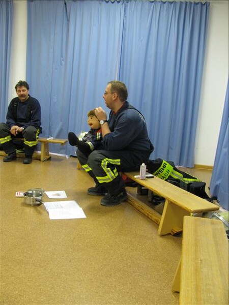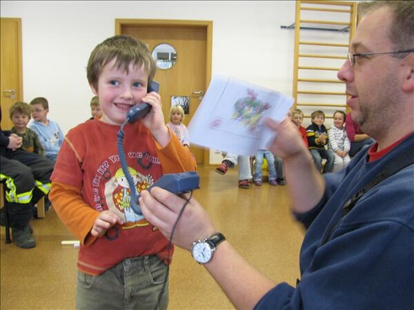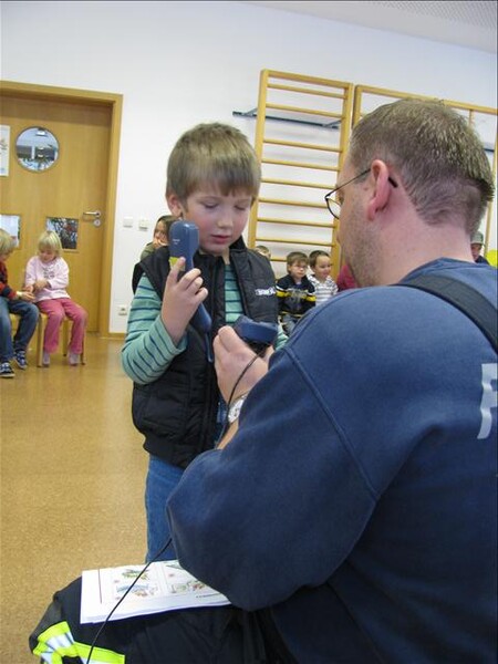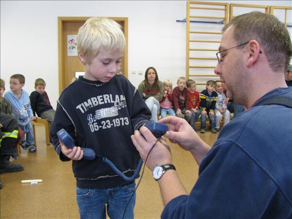 Weiter ging es mit dem richtigen Verhalten wenn es wirklich mal brennen sollte und die richtige Meldung des Notrufes bei der Leitstelle auf der 112 zu üben. Selbstverständlich ersetzt diese Brandschutzerziehung vor Ort nicht den Besuch des benachbarten Feuerwehrhauses.