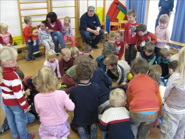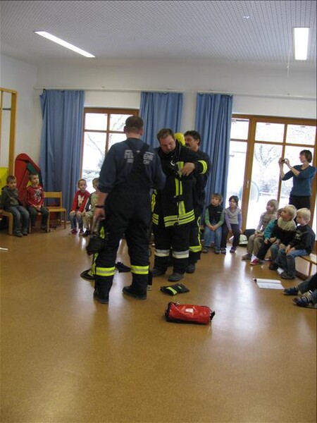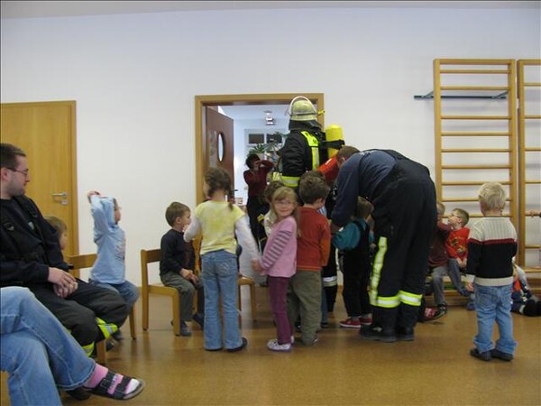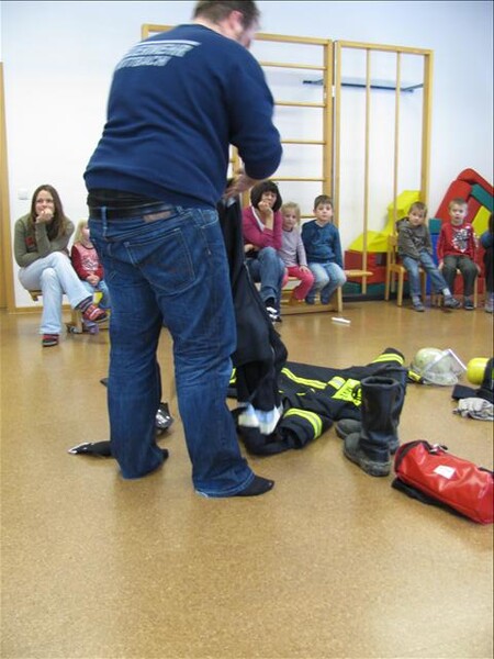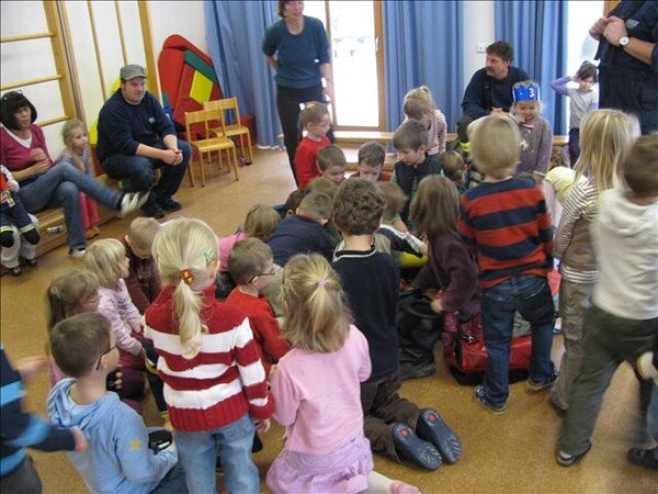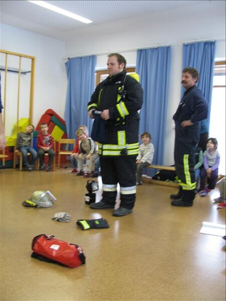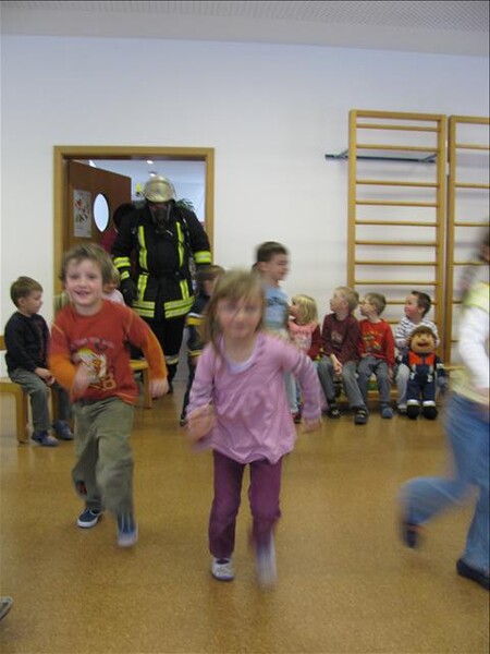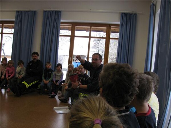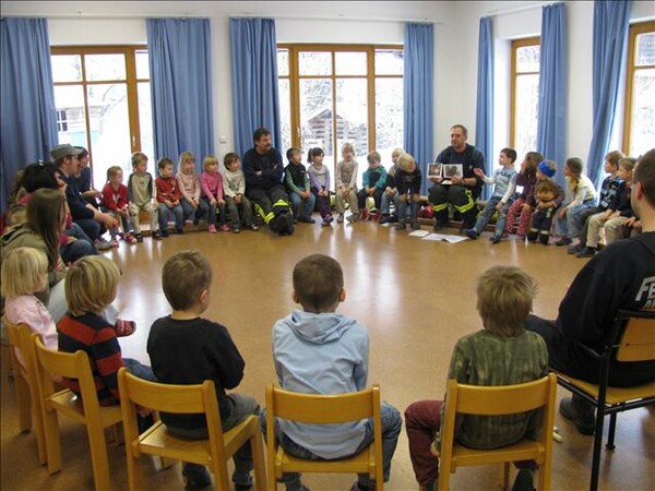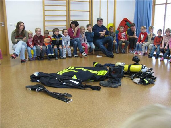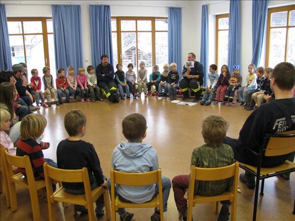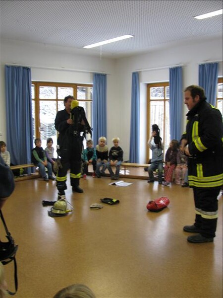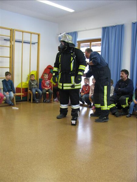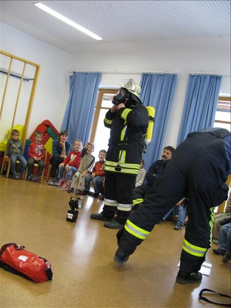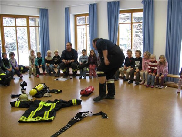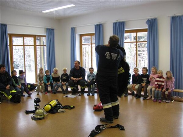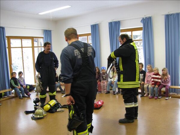 Jetzt war es soweit am 26.11.2010 Vormittags: Die beiden Kommandanten Perzl Josef und Ober Roman sowie die Feuerwehrmänner Männer Christian und Nirschl Michael und die Feuerwehrfrau Perzl Bianca besuchte den Kindergarten. Spielerisch wurden den Kindern das Feuer als Freund und Feind vorgestellt. "Welches Kind möchte auf den Feuerschein seiner Geburtstagskerzen verzichten, aber so schön wie das Feuer der Kerze ist, es kann auch gefährlich sein" - so Brandschutzerzieher Christian Männer