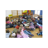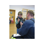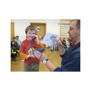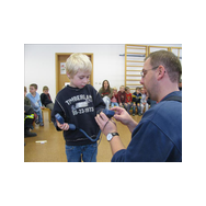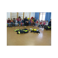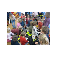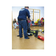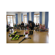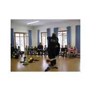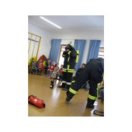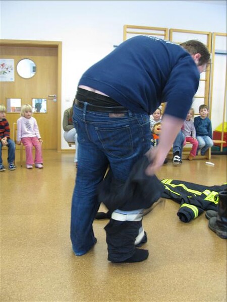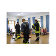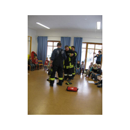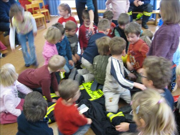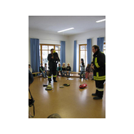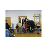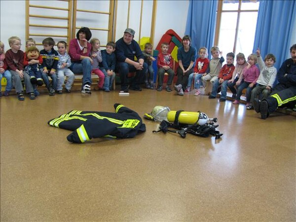 Mit Bildern zeigte er auf, wie das Feuer mit Licht, Wärme und Geborgenheit das Leben bereichert. Wenn es aber außer Kontrolle gerät, wird es zu einer großen Gefahr. Bei allen Übungen wurden die Kinder aktiv in das Geschehen einbezogen. Besondere Freude bereitete es den jungen Zuhörern, beim Ankleiden der Schutzausrüstung mit dem schweren Atemschutz zu helfen. Dadurch wurde die Angst vor einem ausgerüsteten Feuerwehrmann den Kindern spielend genommen.