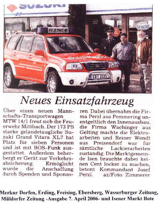 Die Feuerwehr Mittbach schaffte sich einen gebrauchten Suzuki Garand Vitara Geländewagen an. Dieser wurde in eigener Regie aus- und umgebaut. Mit der großzügigen Unterstützung von den Firmen: