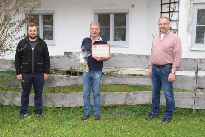 Isen, 2. Mai 2021 - Die Feuerwehr Mittbach bedankt sich beim ehemaligen Kommandaten Josef Perzl, der kürzlich seinen 65. Geburtstag feierte und amit offiziell aus der Feuerwehr